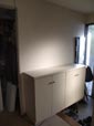 玄関の既存靴箱部分上部に棚を設置して、様々な展示などができるように設計。
